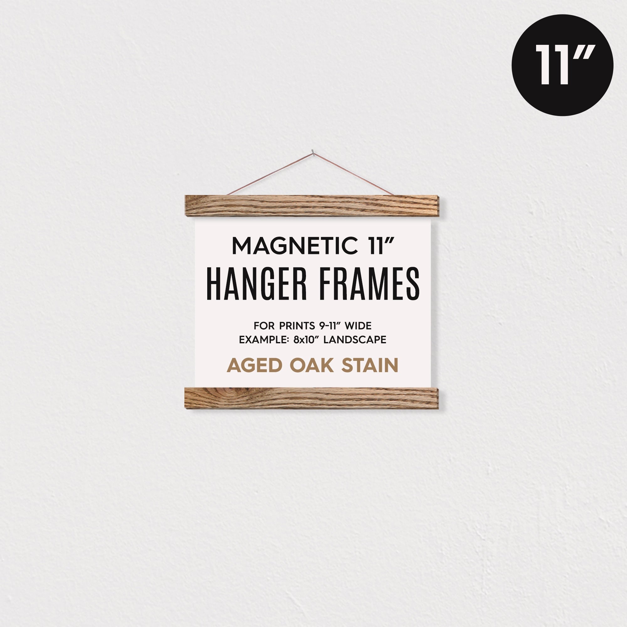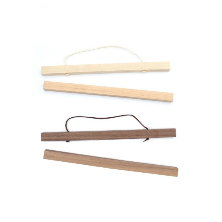 The frame set includes 4 sticks, 2 clamping the top of paper and two clamping the bottom. Neodymium magnets are embedded, keeping the art damage free and allowing you to change out the art at any time! The frame set comes with suede hanger attached.