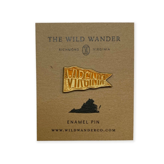 Orange and antique gold enamel pin with illustration of a Virginia flag.