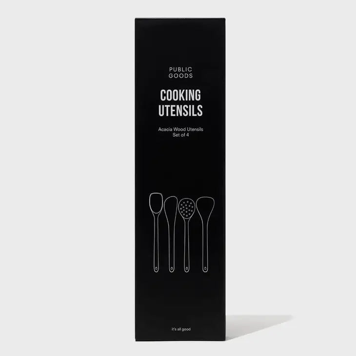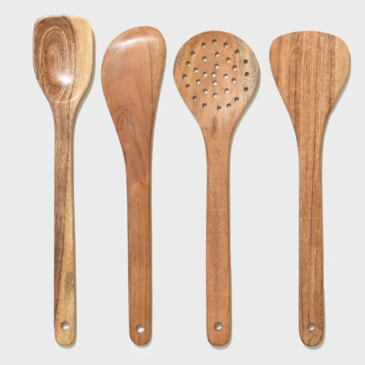 Made of sustainably grown acacia wood, our 4-piece utensils are easy on your cookware. They are highly durable with a sleek and minimal design that rests comfortably in your hands. This thoughtfully made set is long lasting. Our wooden utensils set includes one spoon spatula, one scraper spatula, one slotted spoon and one mixer spatula. Note: Due to the hand crafting process and natural wood material there will be variations and imperfections. What’s in it: Sustainably grown acacia wood.