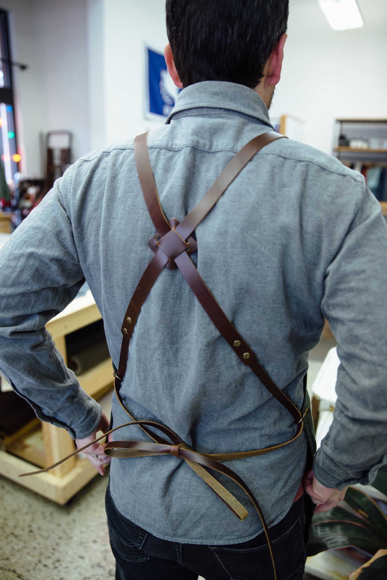 The Everyday Apron is versatile and handy for working, making, cooking, grilling, and whenever you need to keep your clothes clean and tools at your fingertips. Made with durable waxed canvas and soft, full grain leather.
